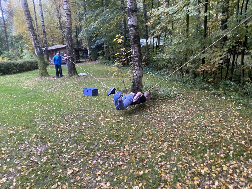Die Anspannung entlädt sich spürbar, als alle spontan Beifall klatschen: Jan hat den „Lavasee" unbeschadet überwunden. Ich jedenfalls hatte ihm das nicht zugetraut und der allgemeine Beifall zeigt, dass auch die anderen zu mindestens schwer beeindruckt sind: Auf einem zwischen zwei weit auseinander stehenden Bäumen befestigten Kletterseil sich mit beiden Händen abgestützt über die „verbotene Zone“ zu bewegen und dabei immer mehr den eigenen Körper in die Waage zu bringen, bis auf dem letzten Meter nur noch 10 cm Platz über dem Boden sind, ist eine unglaubliche Leistung. Lukas, der diese erlebnispädagogische Aktion schon öfter für Gruppen organisiert hat, stellt in der Auswertung fest: „SO hat die Aufgabe noch keine Gruppe gelöst.“ Auch bei einer weiteren Herausforderung im Waldcamp Thalheim hat keiner gekniffen: Es wurde im offenen Tippi mitten im Oktober übernachtet. Beim Frühstück waren sich schlussendlich alle einig: Das machen wir wieder, dann aber mindestens zwei Nächte. Wiederholungsgefahr also 100%.