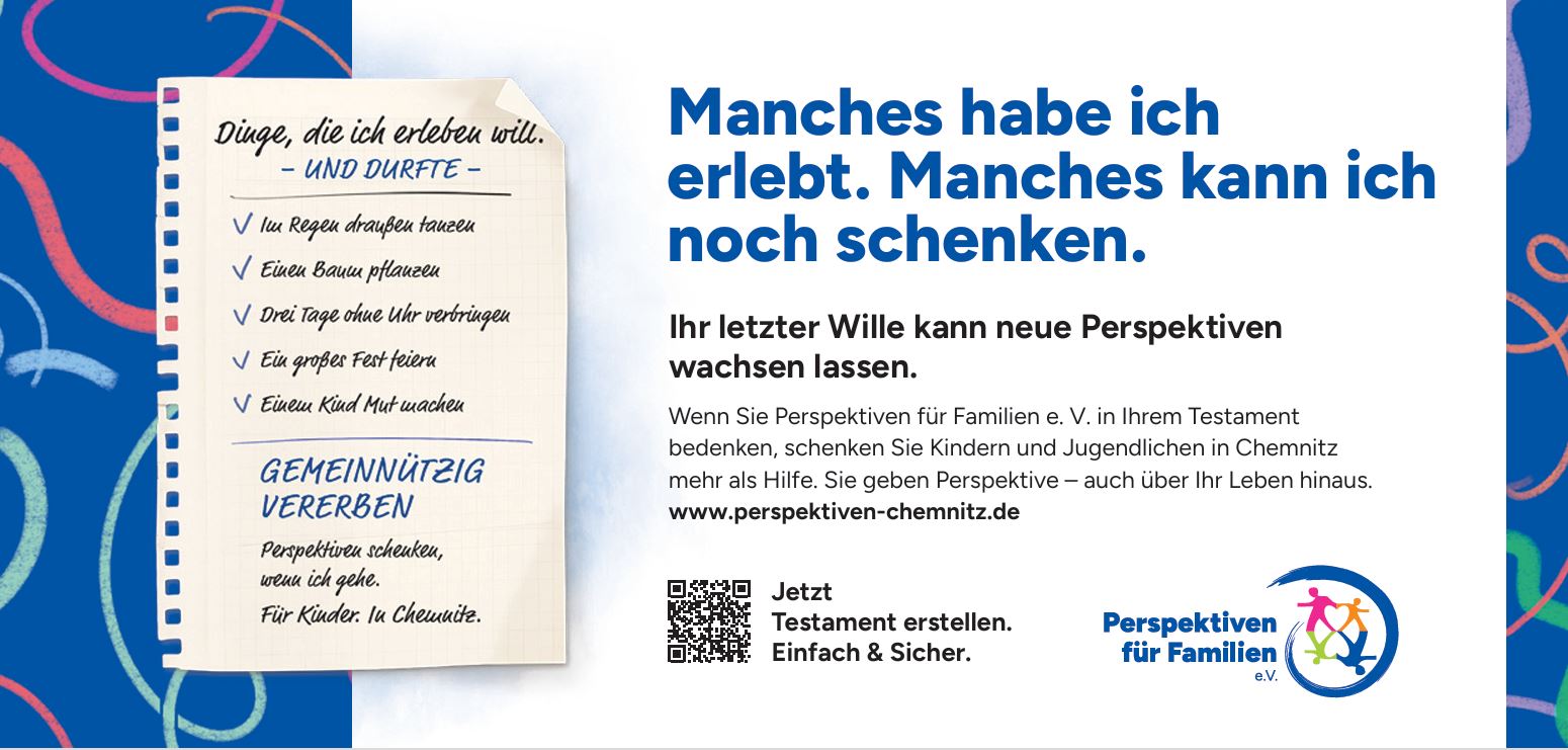 Was bleibt, wenn meine Zeit hier vorüber ist? Eine herausfordernde Frage, der sich nicht jeder gern stellen mag. Doch es ist nie zu früh, sich dem Thema zu widmen, denn ein Testament schafft Klarheit und stellt sicher, dass euer Erbe in euerem Sinne zum Einsatz kommt. Um euch den Zugang dazu zu erleichtern, haben wir uns Folgendes überlegt: Bis September 2026 findet ihr auf unserer Website eine kostenfreie Hilfe, die euch dabei anleitet, ein wirksames Testament zu erstellen. Dabei gibt es auch die Möglichkeit, uns als Verein mit einem Vermächtnis zu bedenken. Wir machen euch Mut: Stellt sicher, dass euer Erbe auch in Zukunft Wertvolles bewirkt. Auf unserer Website findet ihr nähere Informationen: https://www.perspektiven-chemnitz.de/unterstuetzen/testament/